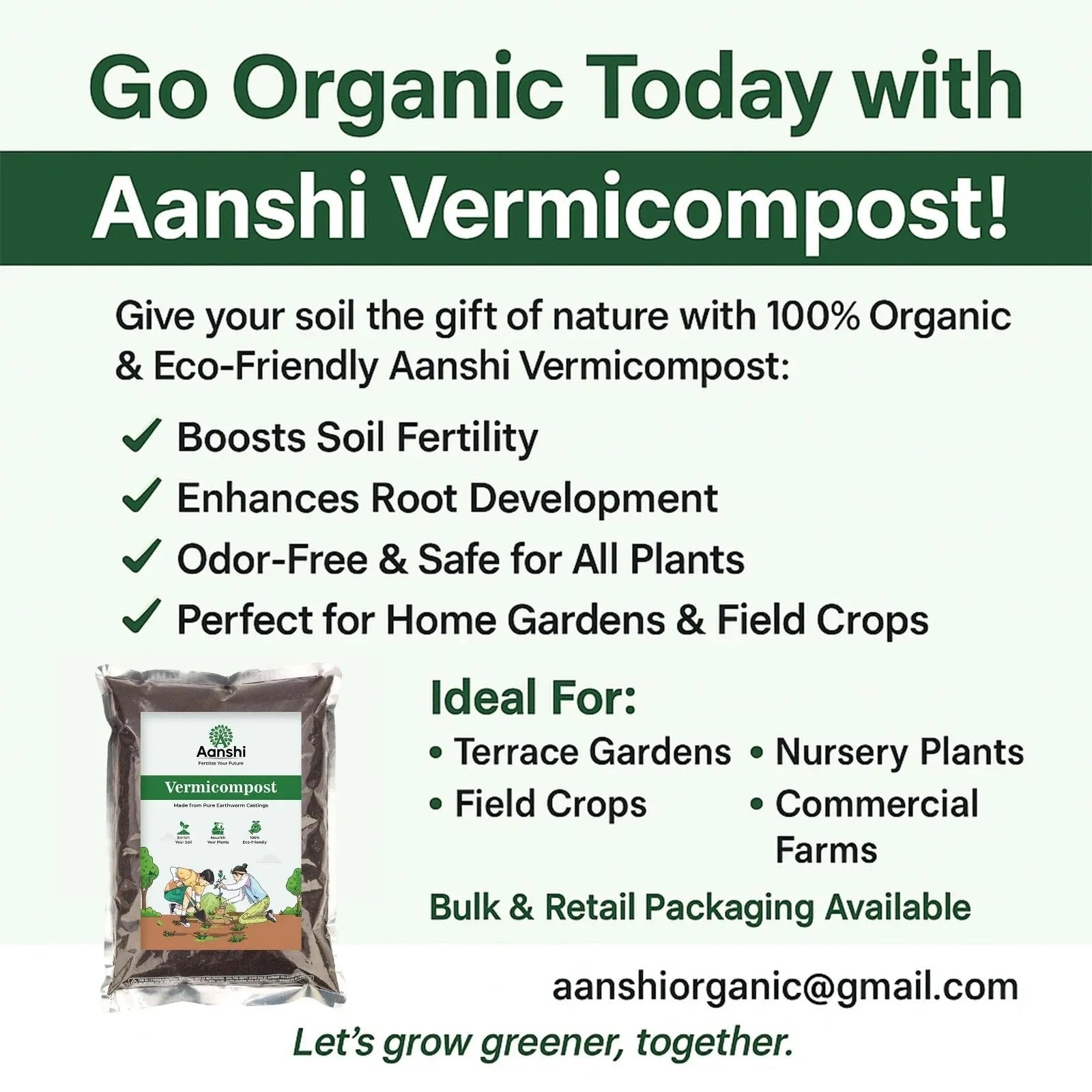 Give your plants the organic boost they deserve with Aanshi Organic Vermicompost, made from 100% pure earthworm castings. This eco-friendly, nutrient-rich fertilizer is perfect for home gardens, potted plants, vegetables, flowers, and lawns.